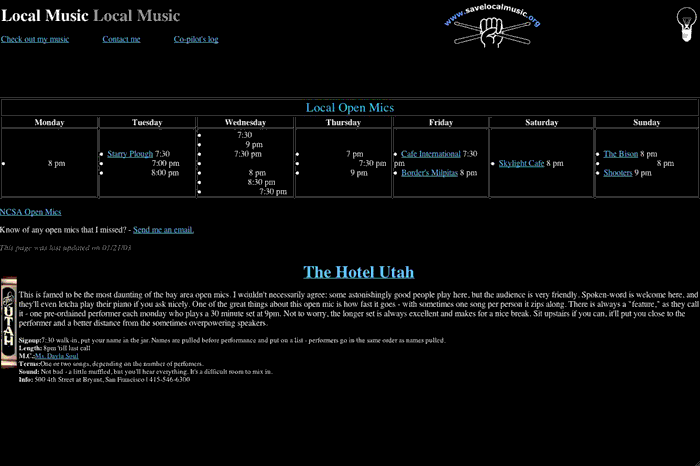 I started taking notes at the open mics I attended and, in 1998, I hand-coded and launched the bay area open mic calendar at www.lightholder.net. I am not a web designer. It (the first version of this calendar) was not pretty.